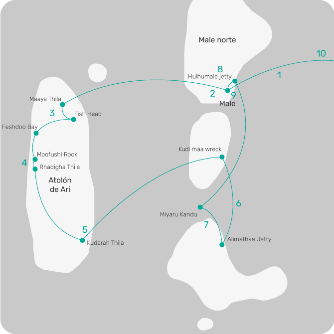 Maldivas es uno de los destinos de buceo más populares de todo el mundo, y por buenos motivos. Además de ser un paraíso fuera del agua, Maldivas tiene una enorme biodiversidad marina que abarca desde vida muy pequeña, hasta los más grandes. Disfrutaremos de ver enormes criaturas como diferentes tipos de tiburón (Tiburón Nodriza, Tiburón Gris de Arrecife y Tiburón Ballena), mantas, rayas águila… Pero también peces de diferentes tipos junto a arrecifes que llenan estos fondos de vida y color (Corales Blandos, bancos de Fusileros, Labios Dulces y mucho más)